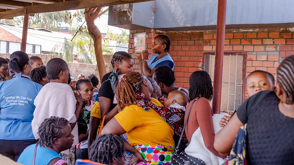 A community health outreach officer conducts an engagement event to raise awareness about cervical cancer and cancer services at the Kanyama Mothers Shelter.
